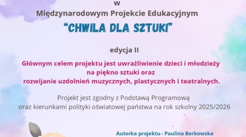 Międzynarodowy Projekt Edukacyjny „Chwila dla sztuki” autorstwa Pauliny i Mariusza Berkowskich ma na celu wprowadzanie uczniów w świat uniwersalnych wartości, takich jak ofiarność, współpraca, solidarność, altruizm, patriotyzm oraz szacunek dla tradycji. Projekt sprzyja budowaniu relacji społecznych, wzmacnianiu poczucia tożsamości indywidualnej, kulturowej i narodowej, a także kształtowaniu postaw opartych na szacunku, empatii i wrażliwości na potrzeby innych.