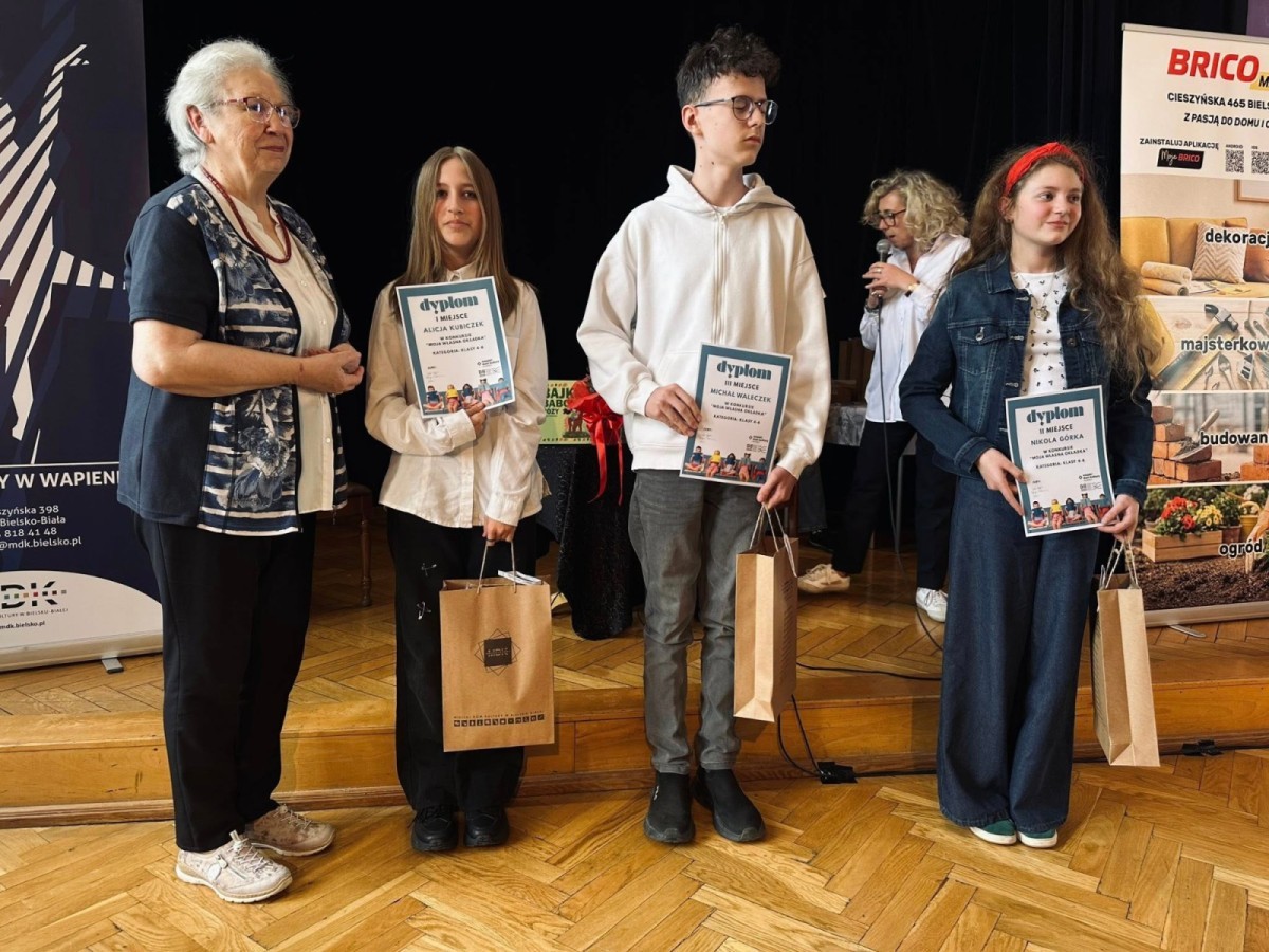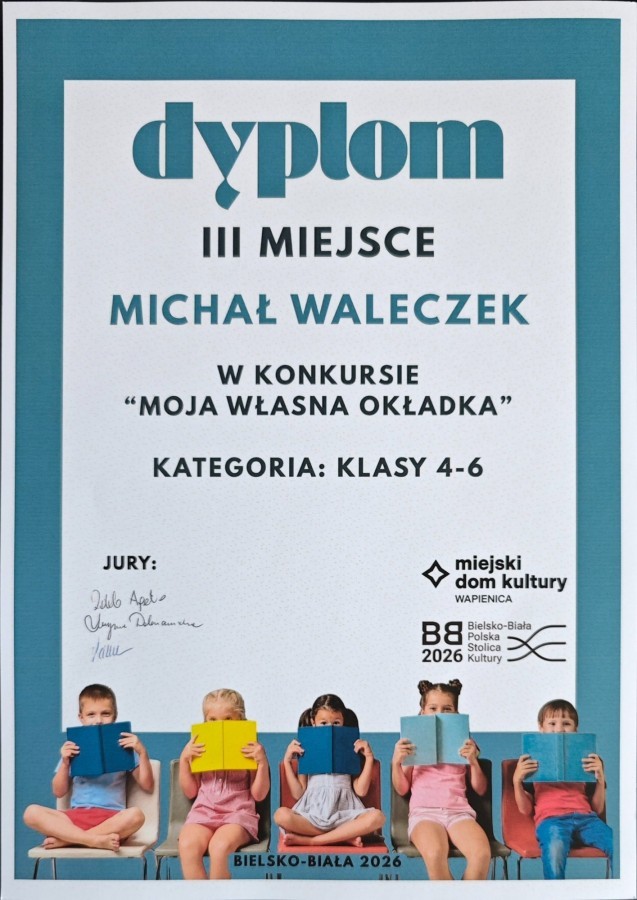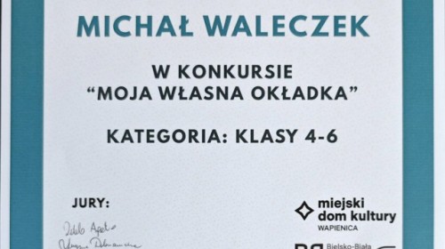 W konkursie plastycznym „Moja własna okładka – projektujemy okładkę do ulubionej książki”, zorganizowanym przez Dom Kultury w Wapienicy, uczeń naszej szkoły, Michał Waleczek, zdobył III miejsce za projekt okładki do książki „Sword Art Online”.