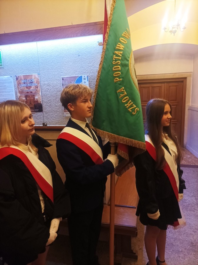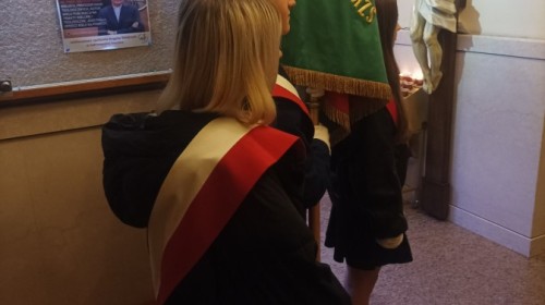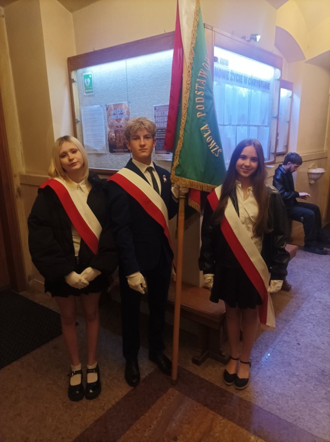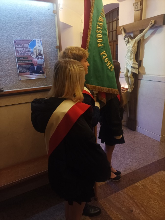 Dzień później 11 listopada poczet sztandarowy naszej szkoły uczestniczył we Mszy Św. w intencji Ojczyzny w kościele w Hałcnowie.