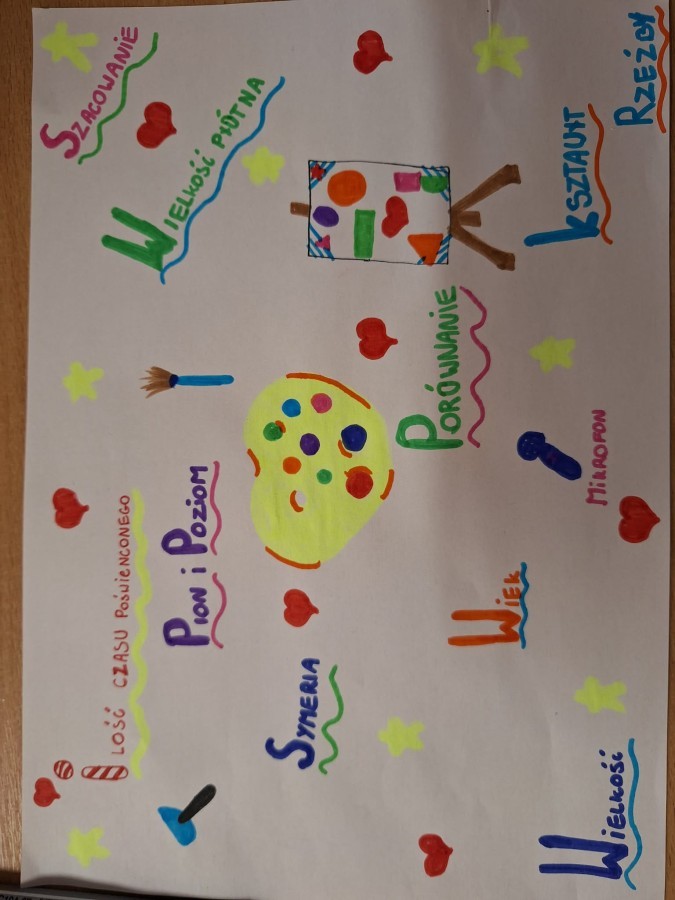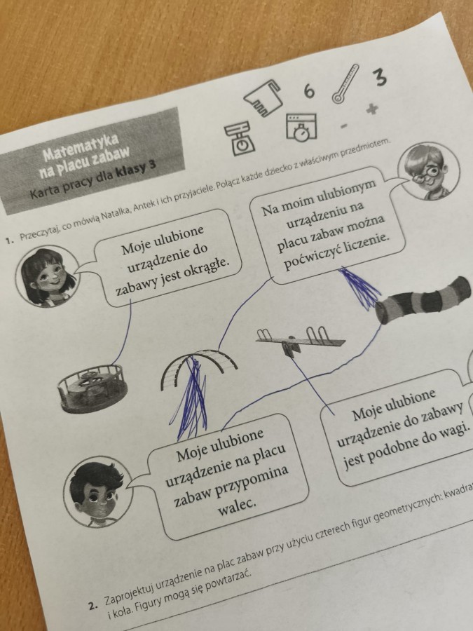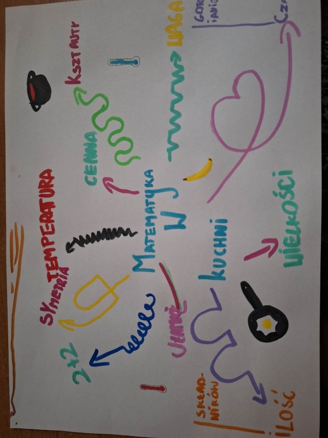 Podczas realizacji modułu „Matematyka na placu zabaw” uczniowie uczyli się obserwować i opisywać elementy matematyczne występujące w ich otoczeniu, takie jak liczby, kształty, rytmy czy pojęcia związane z wielkością i czasem. Efektem pracy były notatki wizualne w formie map myśli, tabel i plakatów.