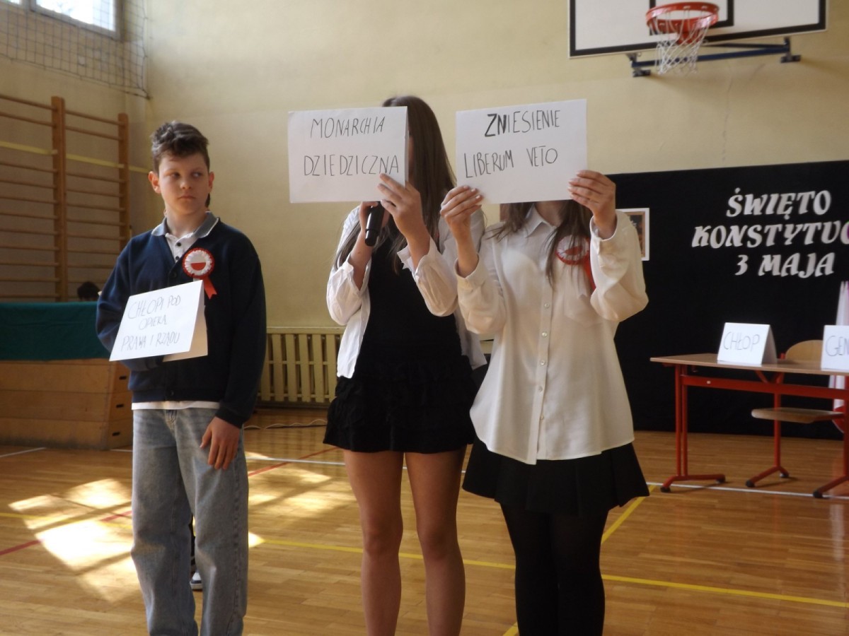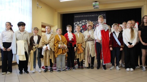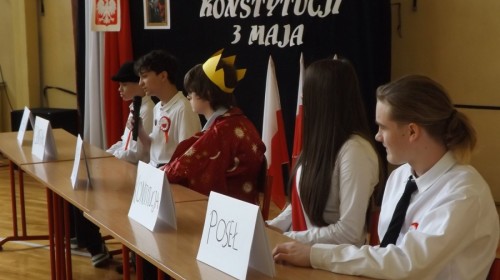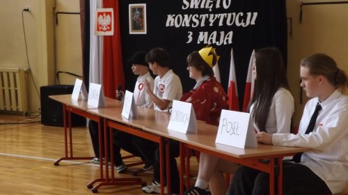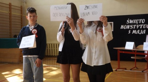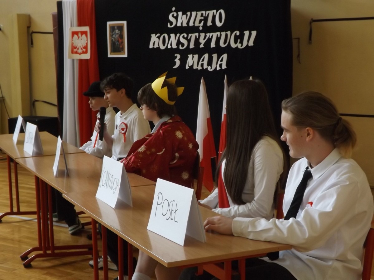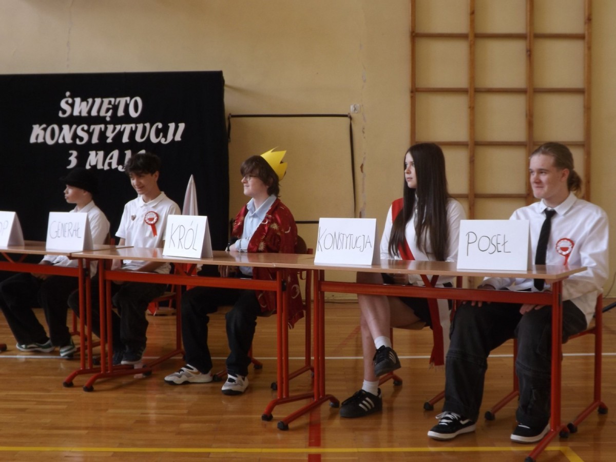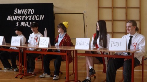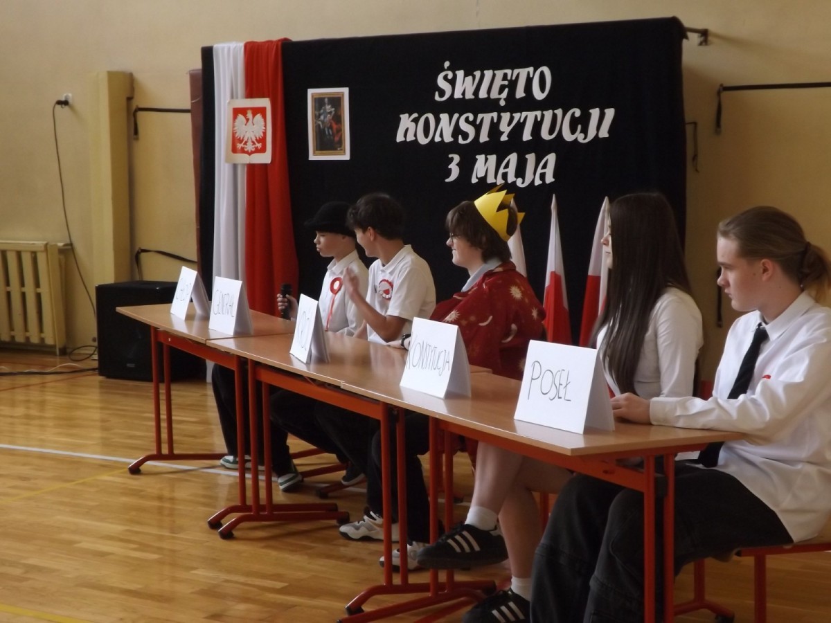 W przystępny i ciekawy sposób przedstawili moment przyjęcia Konstytucji przez króla Stanisława Augusta Poniatowskiego, ukazując znaczenie tych wydarzeń dla historii Polski. Uczniowie podkreślili również, że wartości zapisane w konstytucji mają swoje odzwierciedlenie we współczesnym życiu – zarówno w funkcjonowaniu państwa, jak i naszej szkoły. Zwrócili uwagę na podobieństwa między konstytucją a szkolnym Statutem oraz porównali obrady sejmiku do działalności samorządu uczniowskiego.