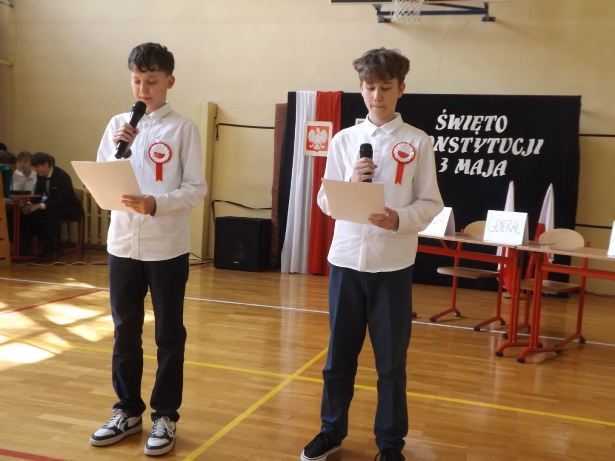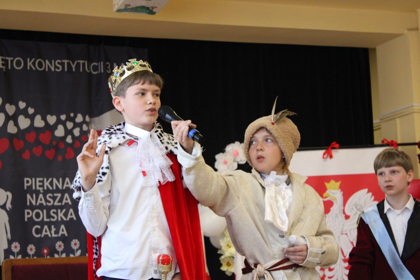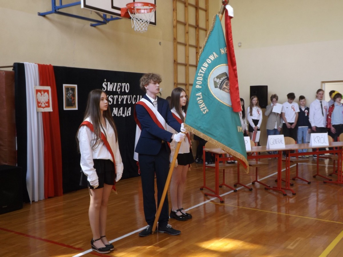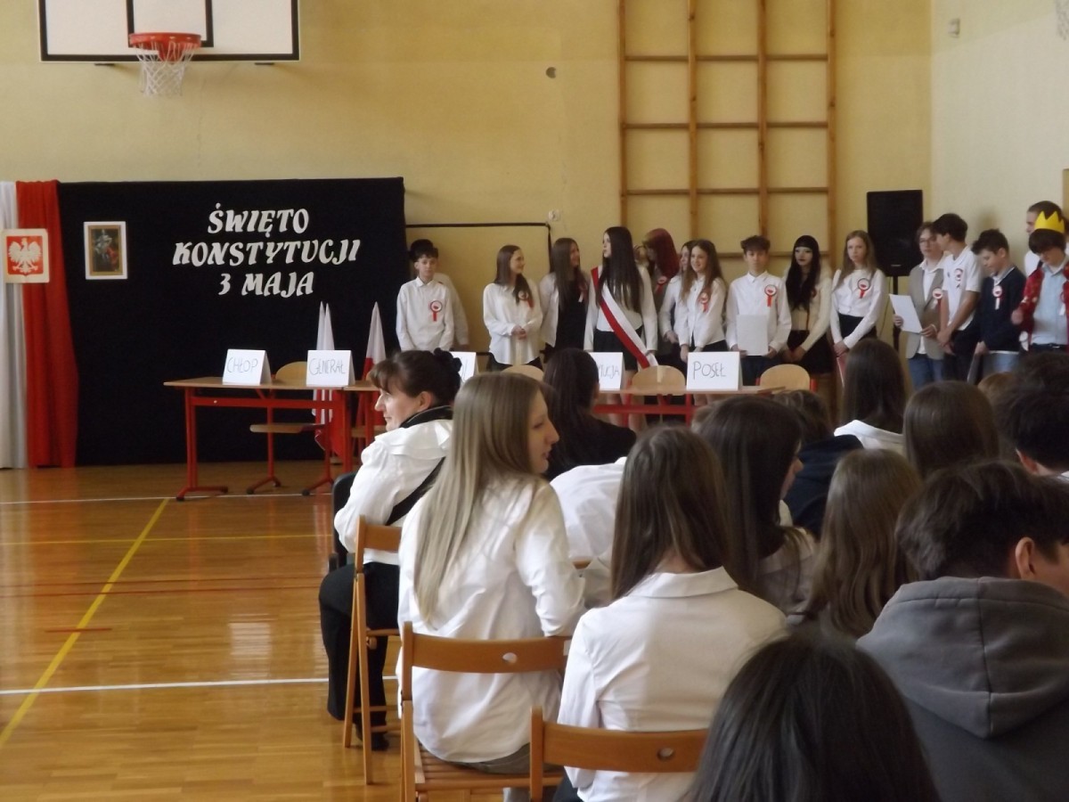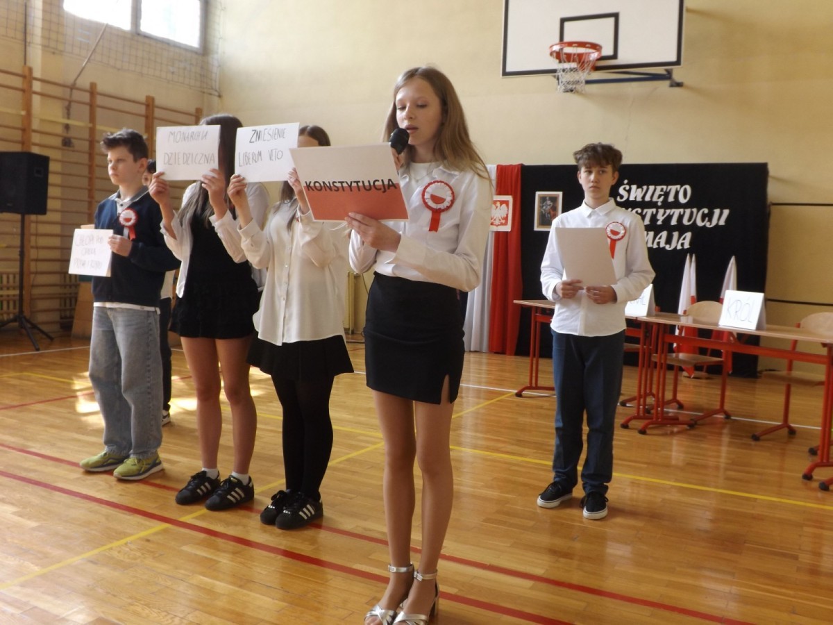 W przystępny i ciekawy sposób przedstawili moment przyjęcia Konstytucji przez króla Stanisława Augusta Poniatowskiego, ukazując znaczenie tych wydarzeń dla historii Polski. Uczniowie podkreślili również, że wartości zapisane w konstytucji mają swoje odzwierciedlenie we współczesnym życiu – zarówno w funkcjonowaniu państwa, jak i naszej szkoły. Zwrócili uwagę na podobieństwa między konstytucją a szkolnym Statutem oraz porównali obrady sejmiku do działalności samorządu uczniowskiego.