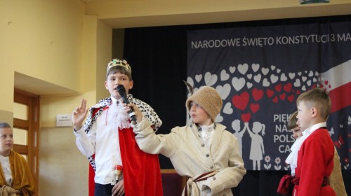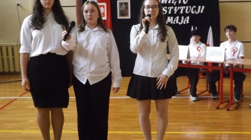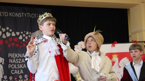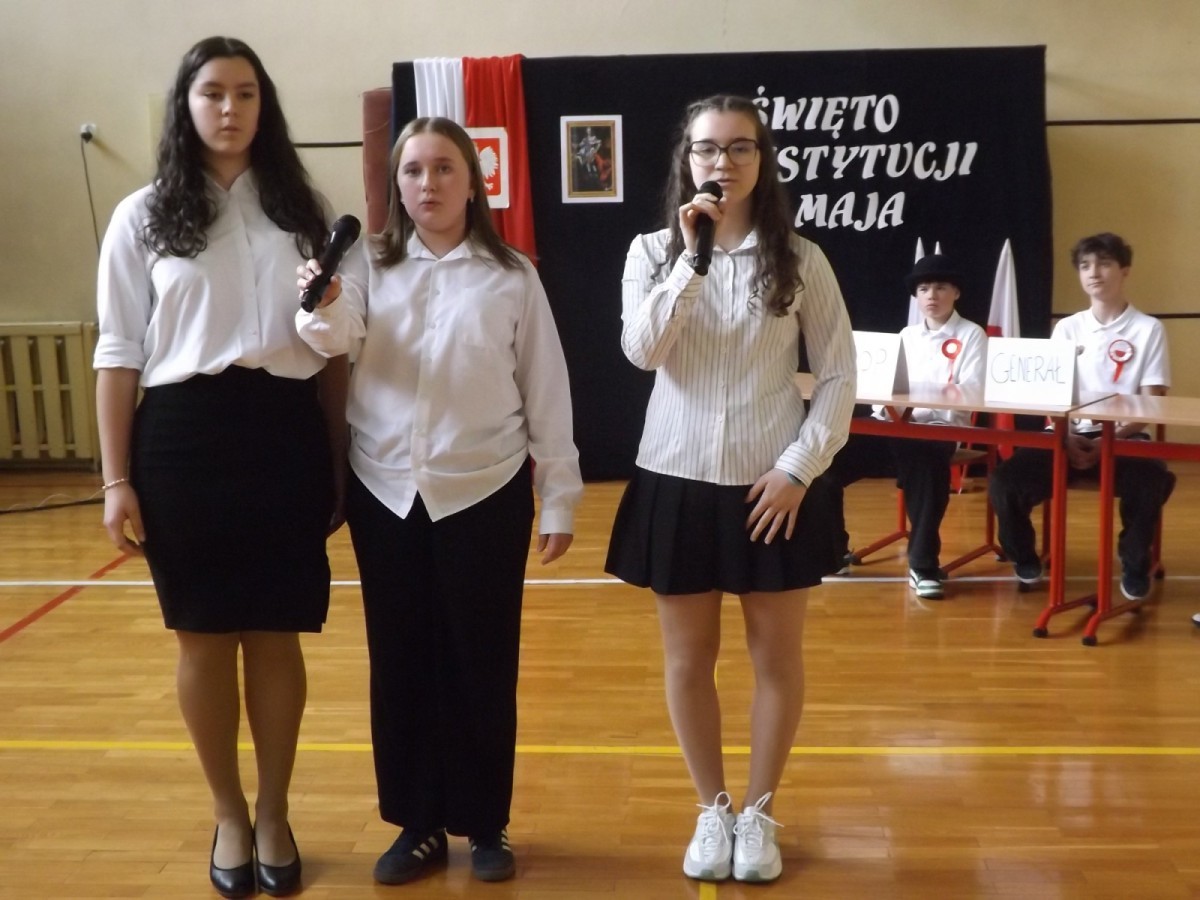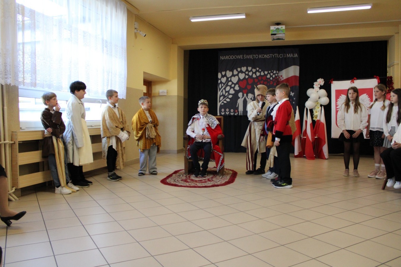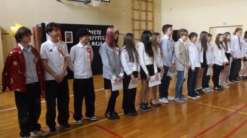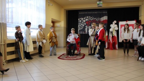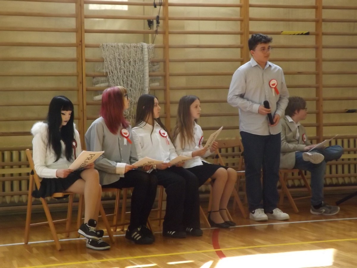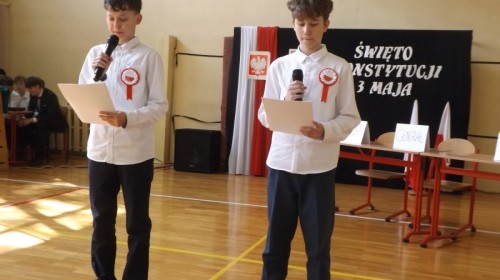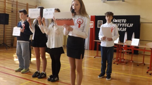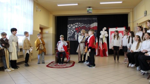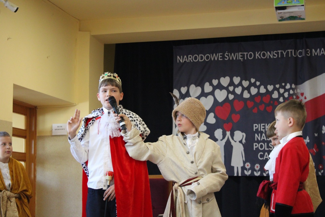 W przystępny i ciekawy sposób przedstawili moment przyjęcia Konstytucji przez króla Stanisława Augusta Poniatowskiego, ukazując znaczenie tych wydarzeń dla historii Polski. Uczniowie podkreślili również, że wartości zapisane w konstytucji mają swoje odzwierciedlenie we współczesnym życiu – zarówno w funkcjonowaniu państwa, jak i naszej szkoły. Zwrócili uwagę na podobieństwa między konstytucją a szkolnym Statutem oraz porównali obrady sejmiku do działalności samorządu uczniowskiego.