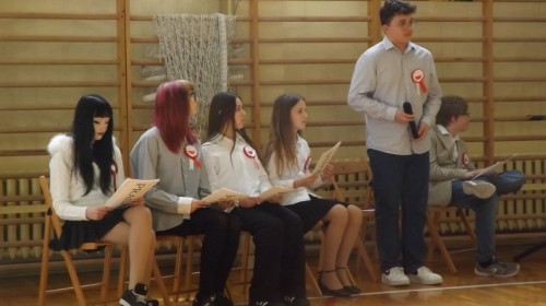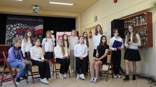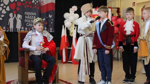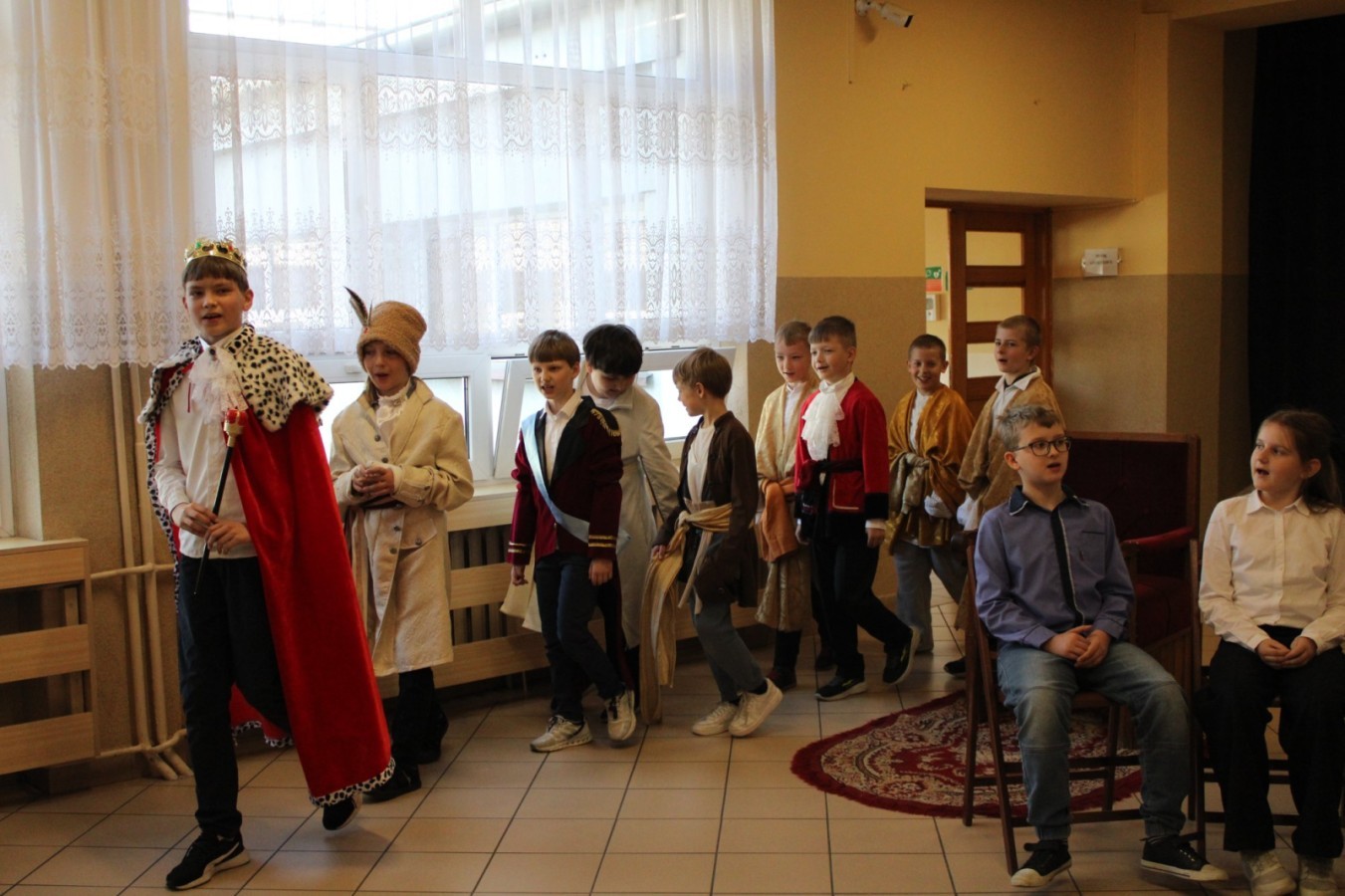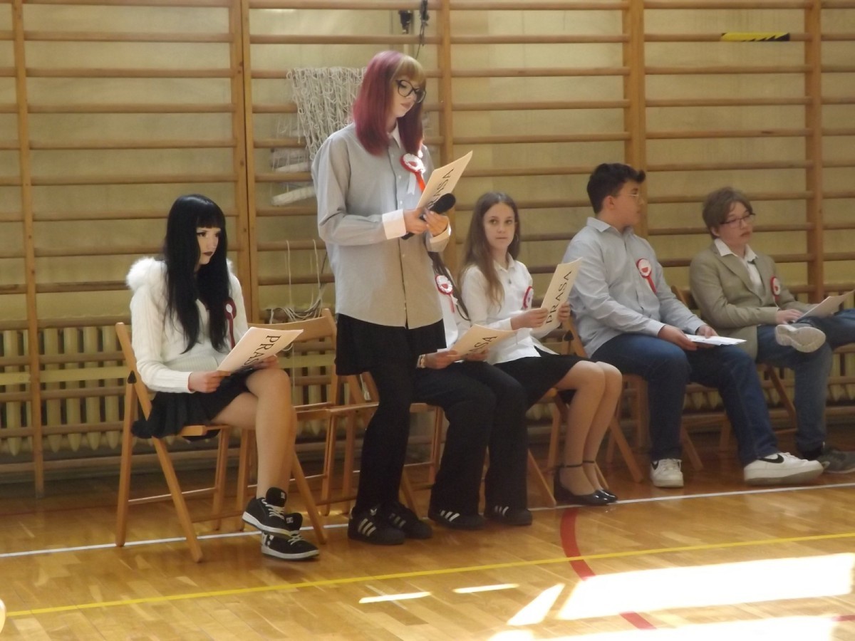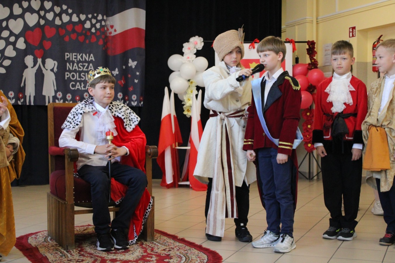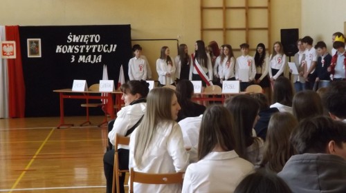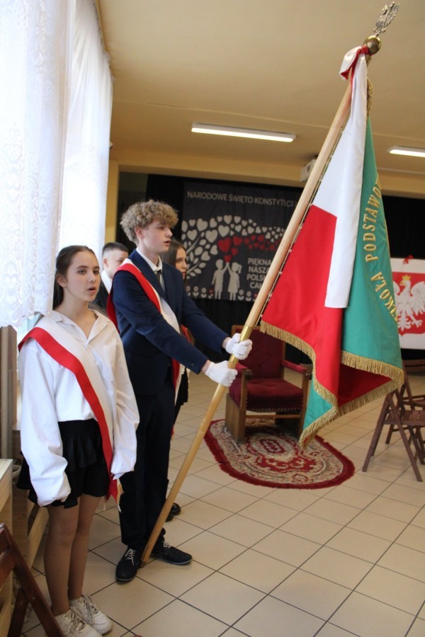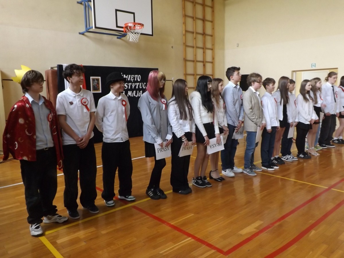 W przystępny i ciekawy sposób przedstawili moment przyjęcia Konstytucji przez króla Stanisława Augusta Poniatowskiego, ukazując znaczenie tych wydarzeń dla historii Polski. Uczniowie podkreślili również, że wartości zapisane w konstytucji mają swoje odzwierciedlenie we współczesnym życiu – zarówno w funkcjonowaniu państwa, jak i naszej szkoły. Zwrócili uwagę na podobieństwa między konstytucją a szkolnym Statutem oraz porównali obrady sejmiku do działalności samorządu uczniowskiego.