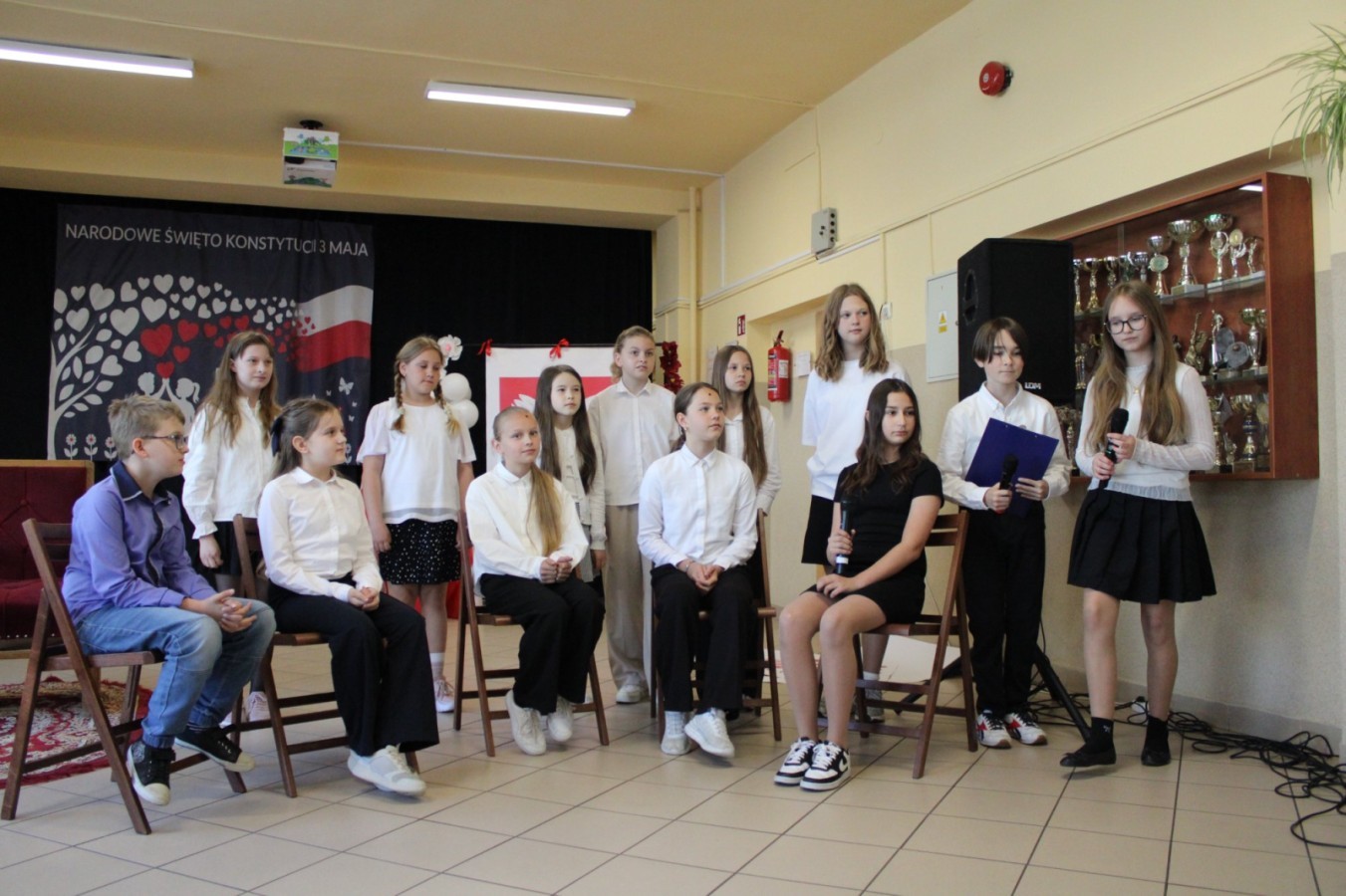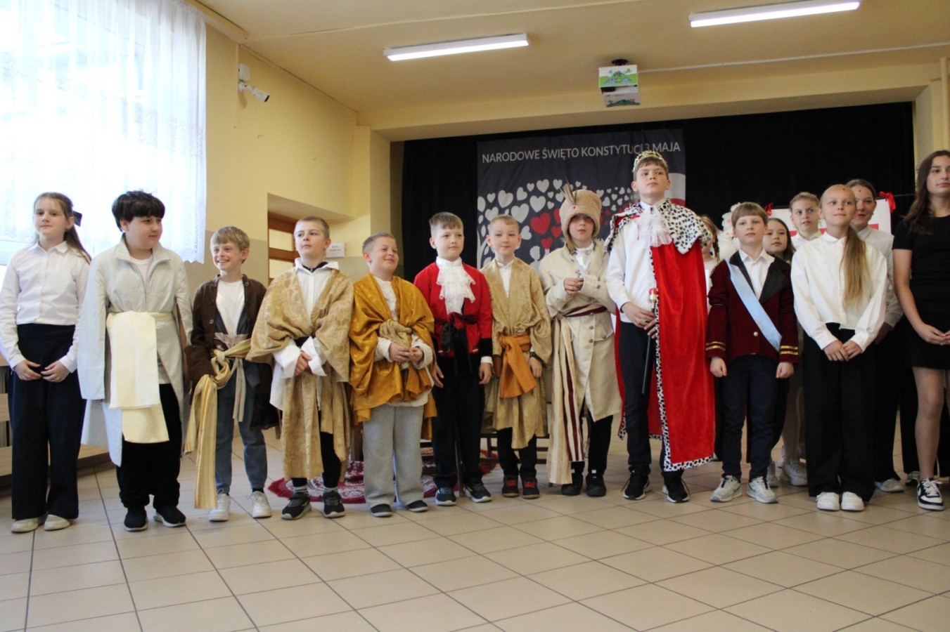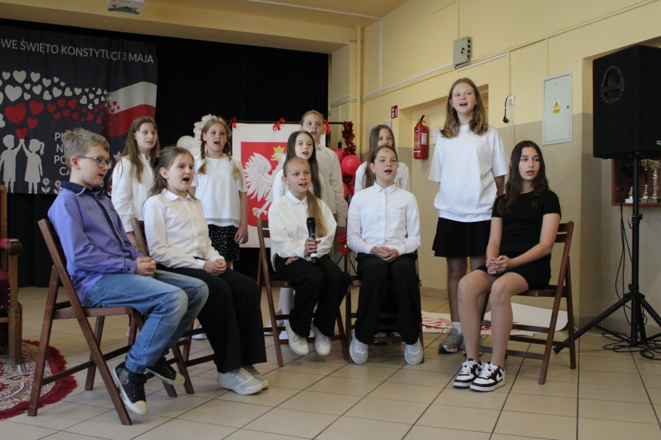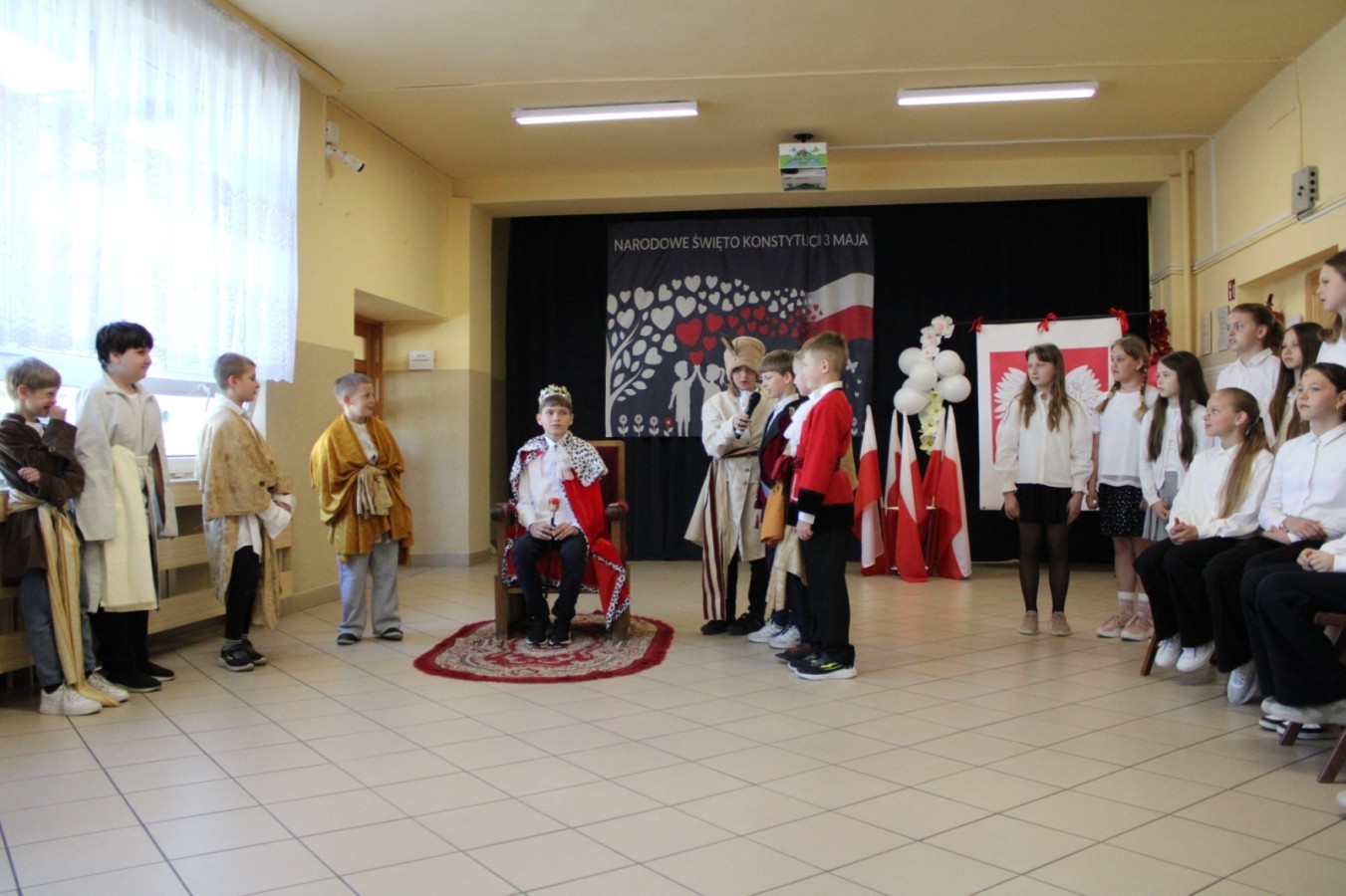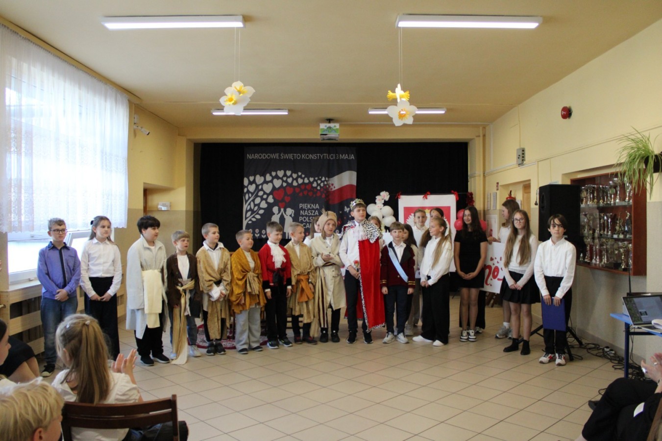 Z okazji rocznicy uchwalenia Konstytucji 3 Maja w naszej szkole odbyło się wyjątkowe wydarzenie. We wtorek, 28 kwietnia, uczniowie klasy 4d przygotowali program artystyczny, który zaprezentowali młodszym i starszym koleżankom i kolegom z klas 1–5.