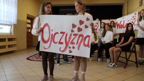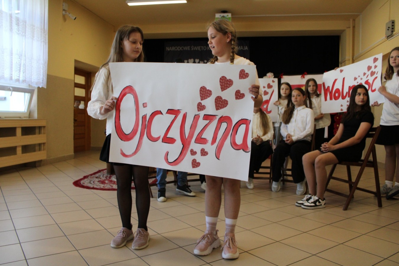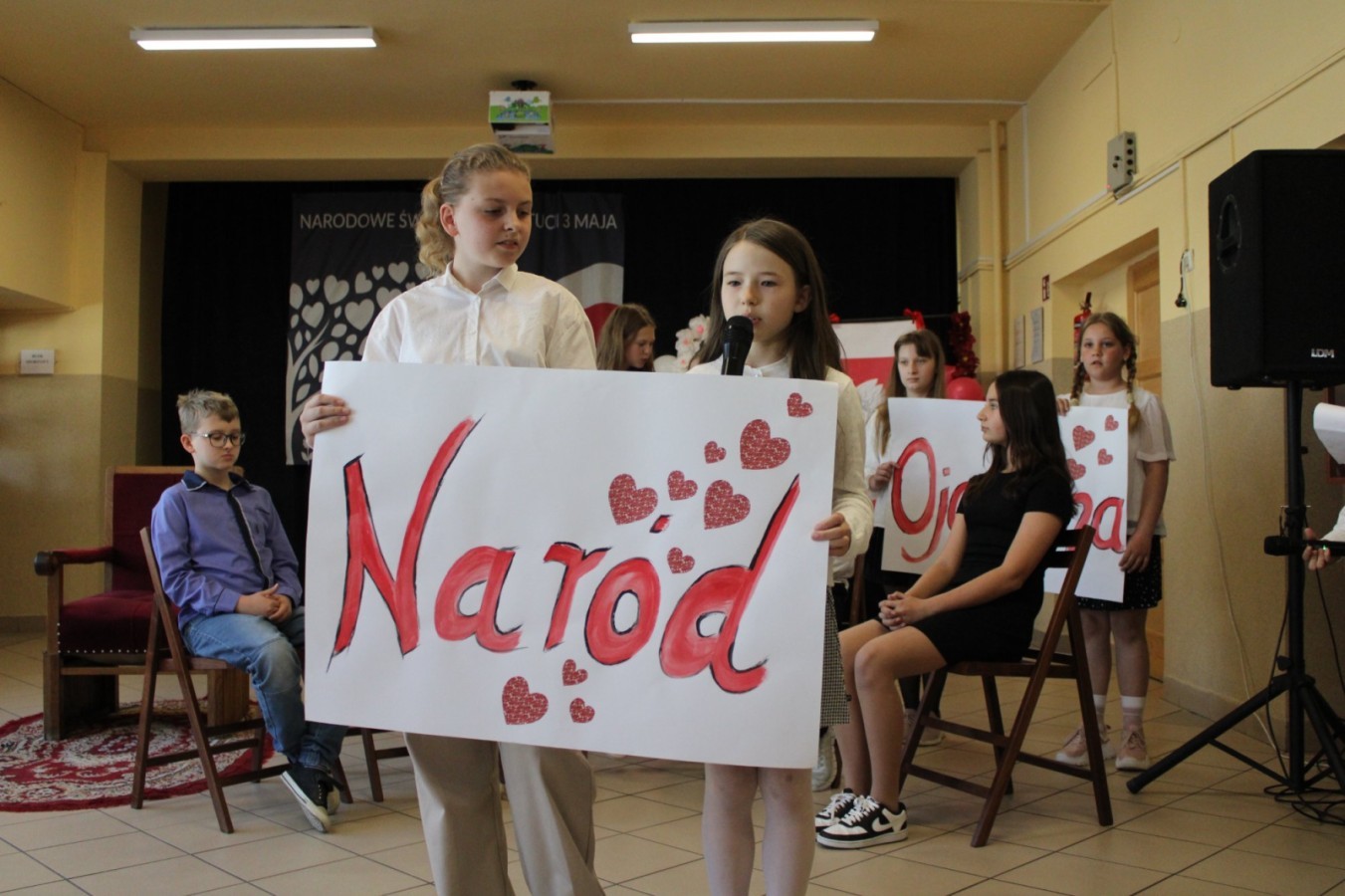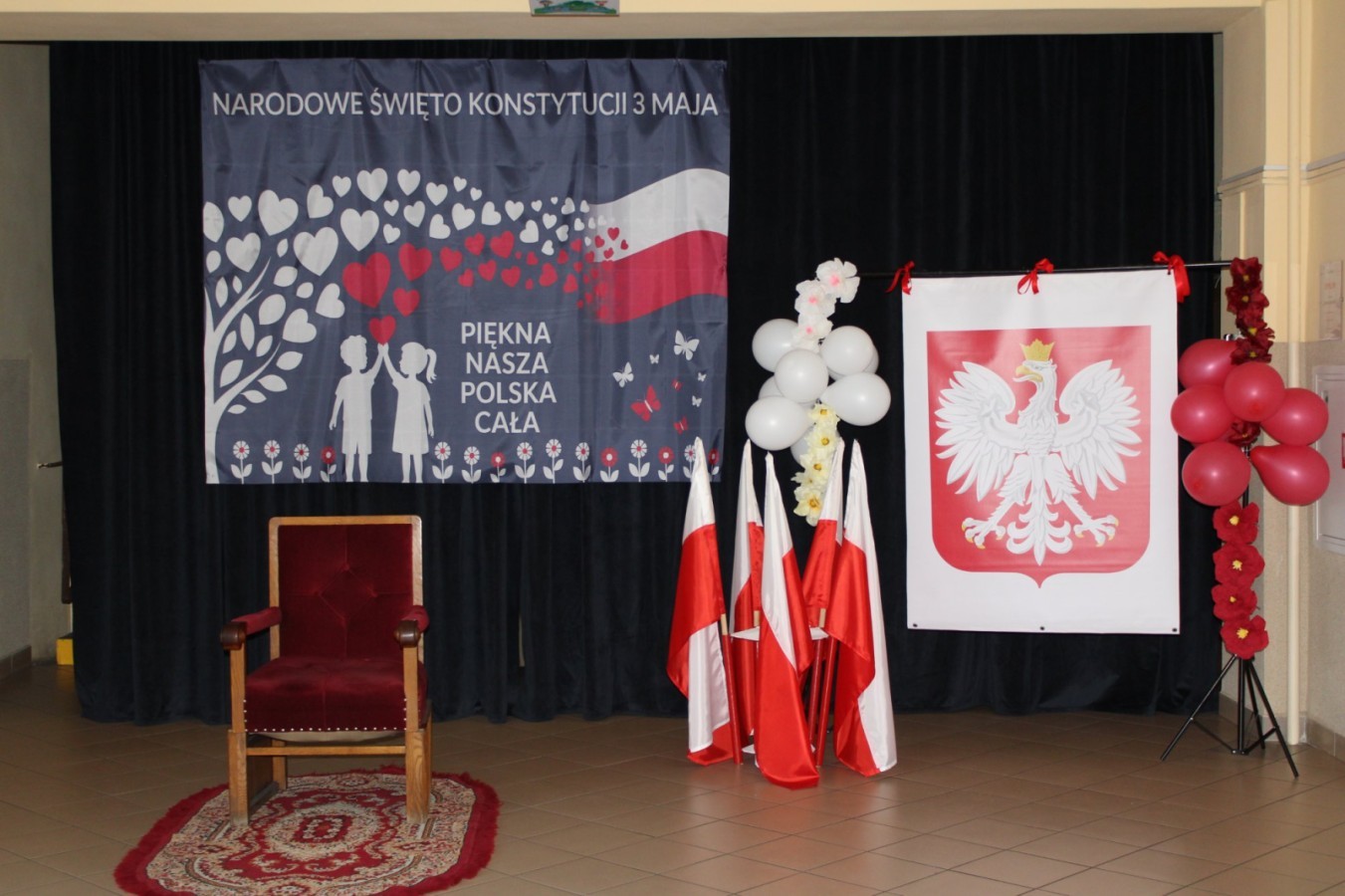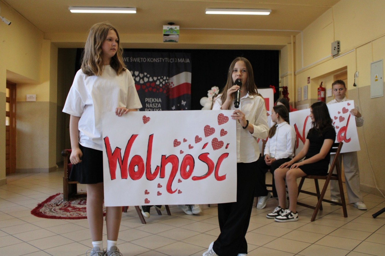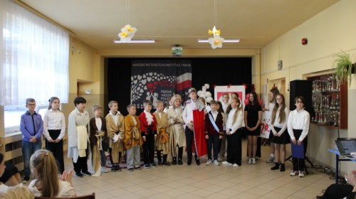 Z okazji rocznicy uchwalenia Konstytucji 3 Maja w naszej szkole odbyło się wyjątkowe wydarzenie. We wtorek, 28 kwietnia, uczniowie klasy 4d przygotowali program artystyczny, który zaprezentowali młodszym i starszym koleżankom i kolegom z klas 1–5.