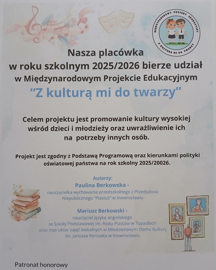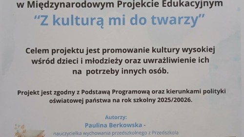 Międzynarodowy Projekt Edukacyjny „Z kulturą mi do twarzy” ma na celu promowanie kultury wysokiej oraz uwrażliwienie uczniów na potrzeby innych osób. Realizowane działania sprzyjały wprowadzaniu dzieci w świat wartości takich jak ofiarność, współpraca, solidarność, altruizm, patriotyzm oraz szacunek dla tradycji. Projekt wspierał budowanie relacji społecznych, wzmacnianie poczucia tożsamości indywidualnej, kulturowej i narodowej oraz kształtowanie postaw opartych na wzajemnym szacunku i odpowiedzialności.