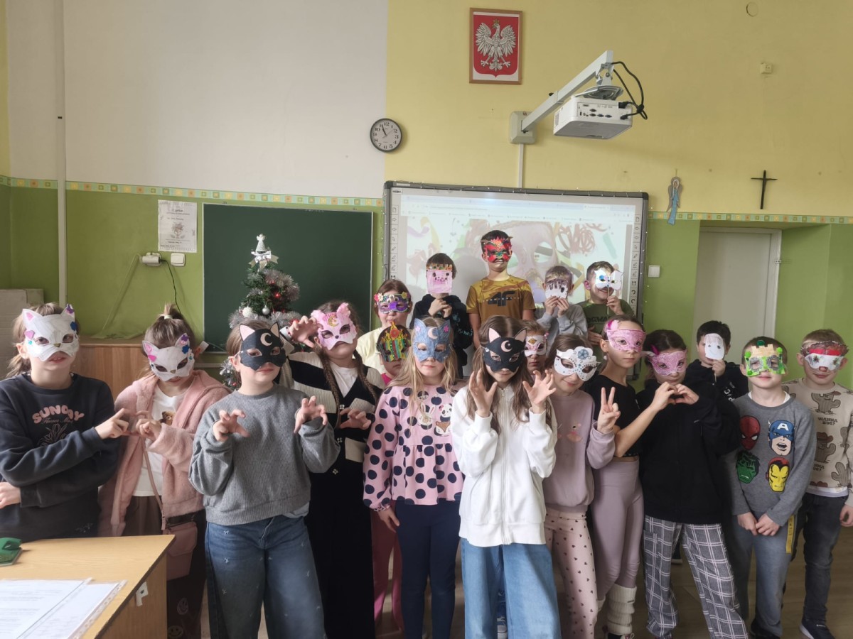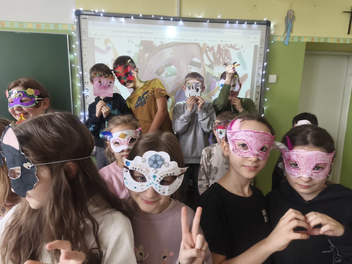 Ostatni IV moduł „Kultury świata” przybliżył uczniom różnorodność tradycji i zwyczajów na świecie. W ramach zajęć „Weneckie maski” dzieci poznały historię masek karnawałowych oraz wykonały własne prace plastyczne. Zajęcia „Karnawał na świecie” pozwoliły na porównanie obchodów, strojów i zwyczajów karnawałowych w Polsce i innych krajach, rozwijając postawę otwartości i tolerancji wobec odmiennych kultur.